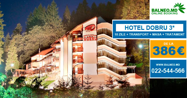 Beneficiaza de tratament la sanatoriu! Romania, Statiunea Slanic Moldova, care este renumita pentru izvoarele sale! (tel. 022 544-566; 27-27-56) Hotelul Dobru 3*, de la 386 euro/ persoana! Beneficiaza de 10 zile/ 9 nopti cazare; masa: 3 ori pe zi, tratament balnear + TRANSPORT tur-retur!